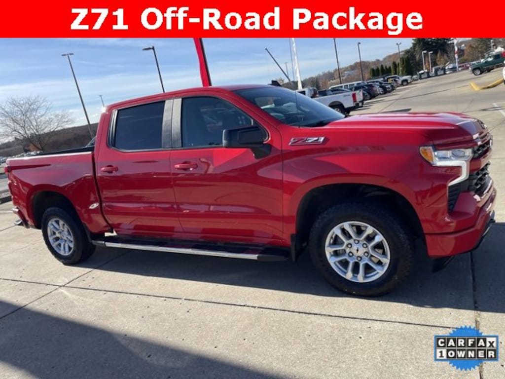 This Silverado 1500 RST comes equipped with Black Cloth, Running Boards, Apple CarPlay/Android Auto, Auto-Locking Rear Differential, Chevrolet Connected Access Capable, Chevytec Spray-On Black Bedliner, Color-Keyed Carpeting Floor Covering, Compass, Convenience Package, Deep-Tinted Glass, Dual Exhaust w/Polished Outlets, Dual Rear USB Ports (Charge Only), Electrical Steering Column Lock, Electronic Cruise Control, EZ Lift Power Lock & Release Tailgate, Front Frame-Mounted Black Recovery Hooks, Front LED Fog Lamps, HD Rear Vision Camera, Heated Driver & Front Outboard Passenger Seats, Heated Power-Adjustable Outside Mirrors, Heated Steering Wheel, Heavy-Duty Air Filter, High Gloss Black Mirror Caps, Hill Descent Control, Hitch Guidance, Illuminated entry, Inside Rear-View Mirror w/Tilt, Keyless Open & Start, Leather Wrapped Steering Wheel, LED Cargo Area Lighting, Off-Road Suspension, OnStar & Chevrolet Connected Services Capable, Power Windows, Chevrolet Infotainment 3 Premium, Protection Package, Rear 60/40 Folding Bench Seat (Folds Up), Remote Keyless Entry, Remote Start, SiriusXM w/360L, Standard Suspension Package, Standard Tailgate, Steering Wheel Audio Controls, Theft Deterrent System (Unauthorized Entry), Trailering Package, Wi-Fi Hot Spot Capable, Wireless Phone Projection & Z71 Off-Road Package. This Silverado delivers 14/19 City/Highway MPG. Clean CARFAX & CARFAX One-Owner Verified. Odometer is 2542 miles below market average!